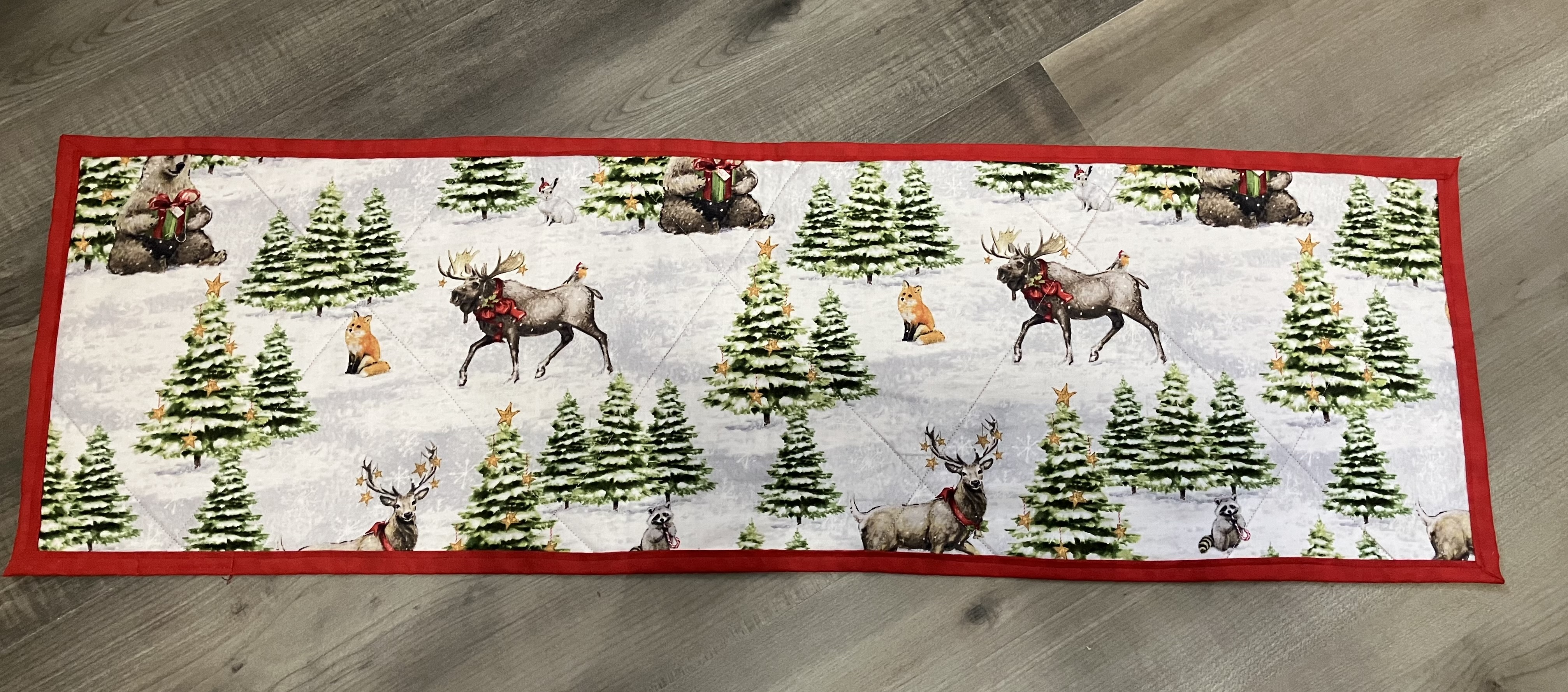 This table runner features moose, deer, fox, bears and a candy cane eating racoon waiting to for Santa to arrive.